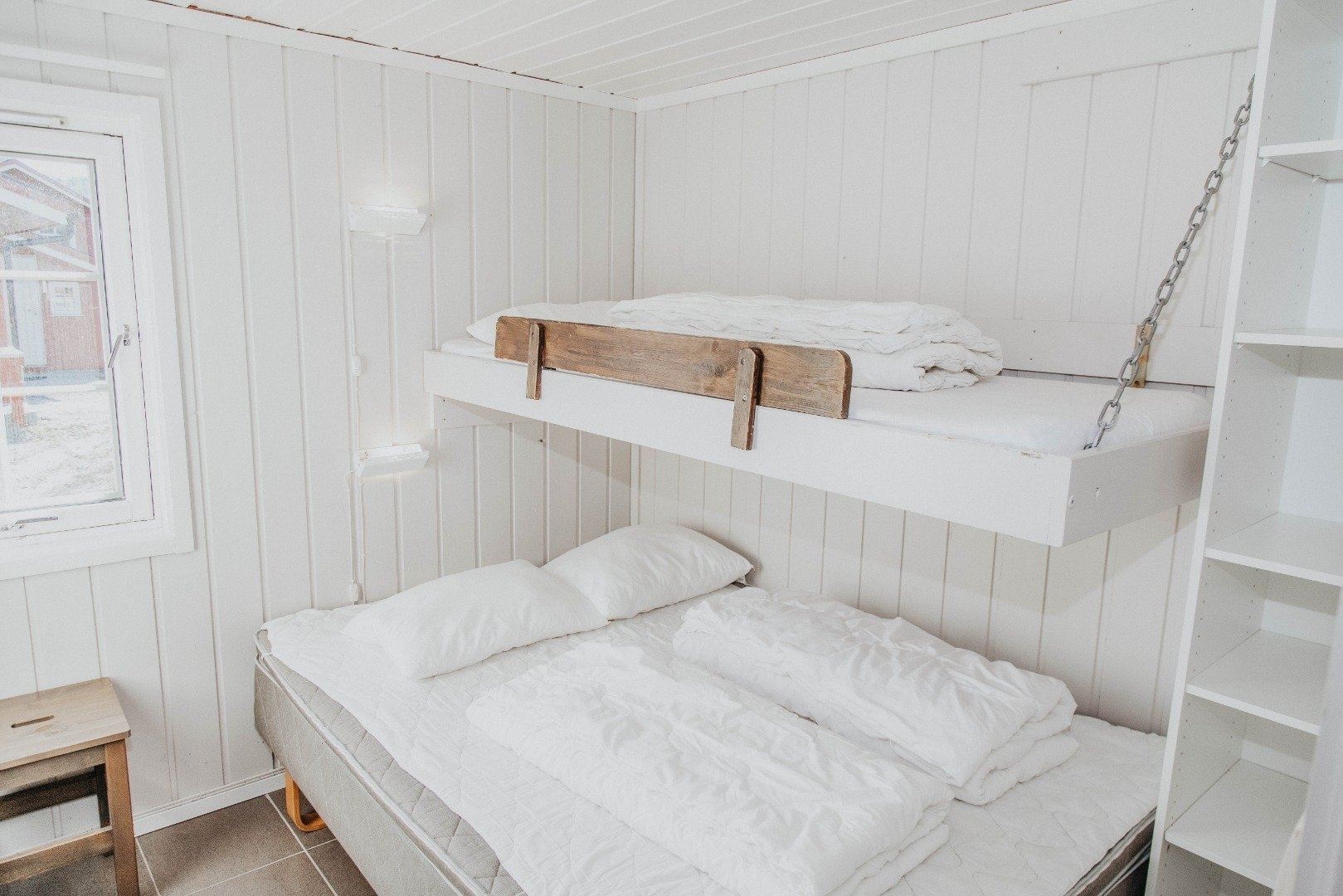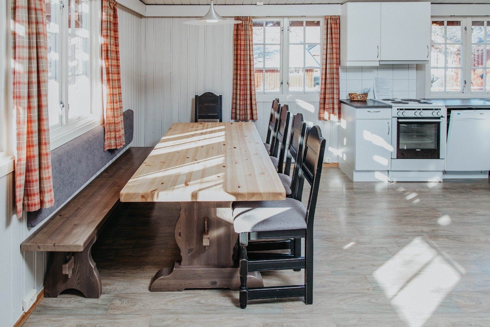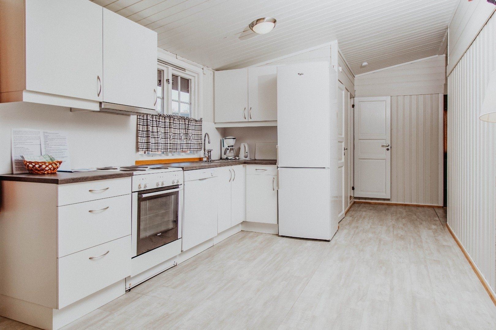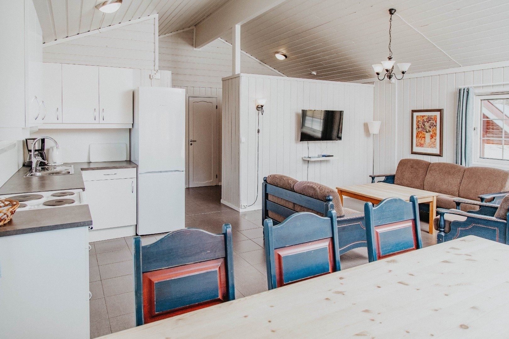 Fritstående komfortable hytter med stue, åbent køkken samt badeværelse. Køkkenet er udstyret med kaffemaskine, komfur/ovn, køleskab med fryser, opvaskemaskine samt nødvendigt service. Hytterne er indrettet med 3 til 5 soveværelser med plads til enten 9 eller 11 personer. Derudover tilbydes storhytte med plads til 24 personer.